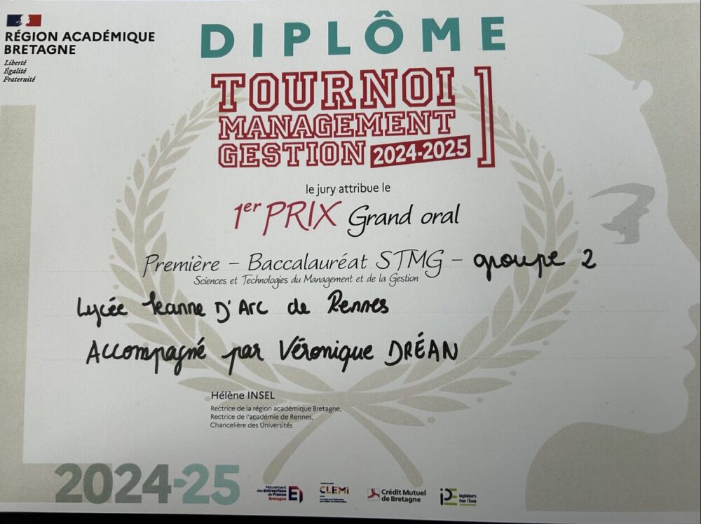 1ère STMG Monde : 4 élèves remportent le premier prix du grand oral au tournoi Management et Gestion à l'Académie de Rennes