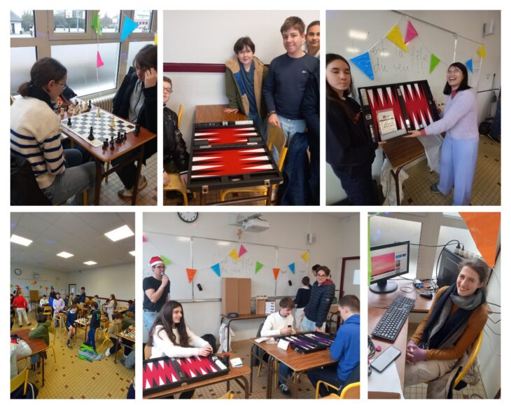 Aux rendez-vous Échecs et Backgammon dès lundi et vendredi midi, c’était Noël avant l’heure pour la cinquantaine d’élèves présents ! Merci à l’Enseignement Catholique pour l’achat de nouveau matériel de jeu à disposition des élèves : 4 nouvelles horloges de jeu et un nouveau plateau de Backgammon. Bravo aux gagnants du tournoi des débutants Charlotte Caron, Louis Loisel et Mathilde Quintin, qui gagnant un livre de Backgammon, des bons d’achat à la librairie Le Failler de Rennes, des cadeaux de la librairie La nuit des Temps, des jeux d’Escape Game offerts par Get Out Rennes, et jeu de Backgammon ! Début des championnats 2026 en Janvier !