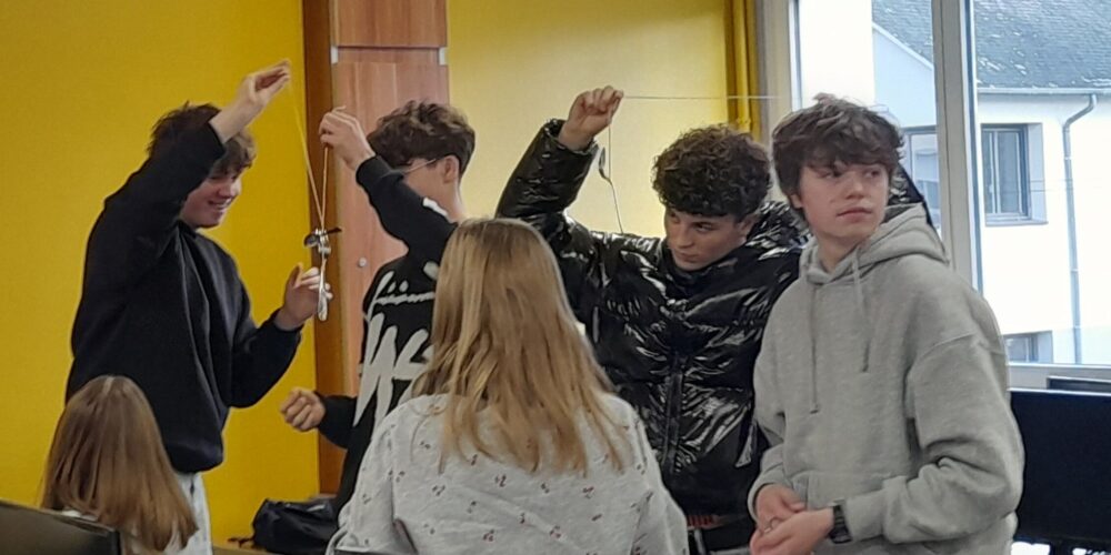 Monsieur Graizeau nous a ensuite mis en situation expérimentale sur le son : A partir d’une cuillère reliée à 2 ficelles de cuisine, nous devions trouver la manière d’entendre le son d’une cloche sans que les autres entendent. Nous avons apprécié le fait d’avoir du temps pour expérimenter et manipuler avant de trouver la solution par nous-mêmes. Charte respectée, moment d’apprentissage ludique assuré !