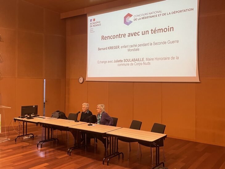 Après une présentation du thème d'année "Résister à la Déportation en France et en Europe" par l'Inspecteur d'histoire-géo, nos 27 élèves ont entendu le témoignage de Bernard Kryger, 88 ans, enfant caché de la Seconde Guerre mondiale, miraculé de la rafle du Vel d'Hiv (16 juillet 1942). Le père de Bernard Kryger, Abraham, juif d'origine polonaise réfugié en France, est mort à Auschwitz en mai 1942. Caché chez des amis à Corps-Nuds jusqu'à septembre 1942, Bernard Kryger a ensuite survécu en Dordogne, sous la protection de fermiers. Ces derniers ont été reconnus Justes parmi les nations. L'épisode de Corps-Nuds n'a été redécouvert que récemment par la famille Kryger comme le relate un article de Ouest-France. Un beau témoignage que nos élèves auront maintenant à cœur de relayer. M Fournis, professeur d'histoire-géo et pilote du Concours Nationale de la Résistance et de la Déportation.
