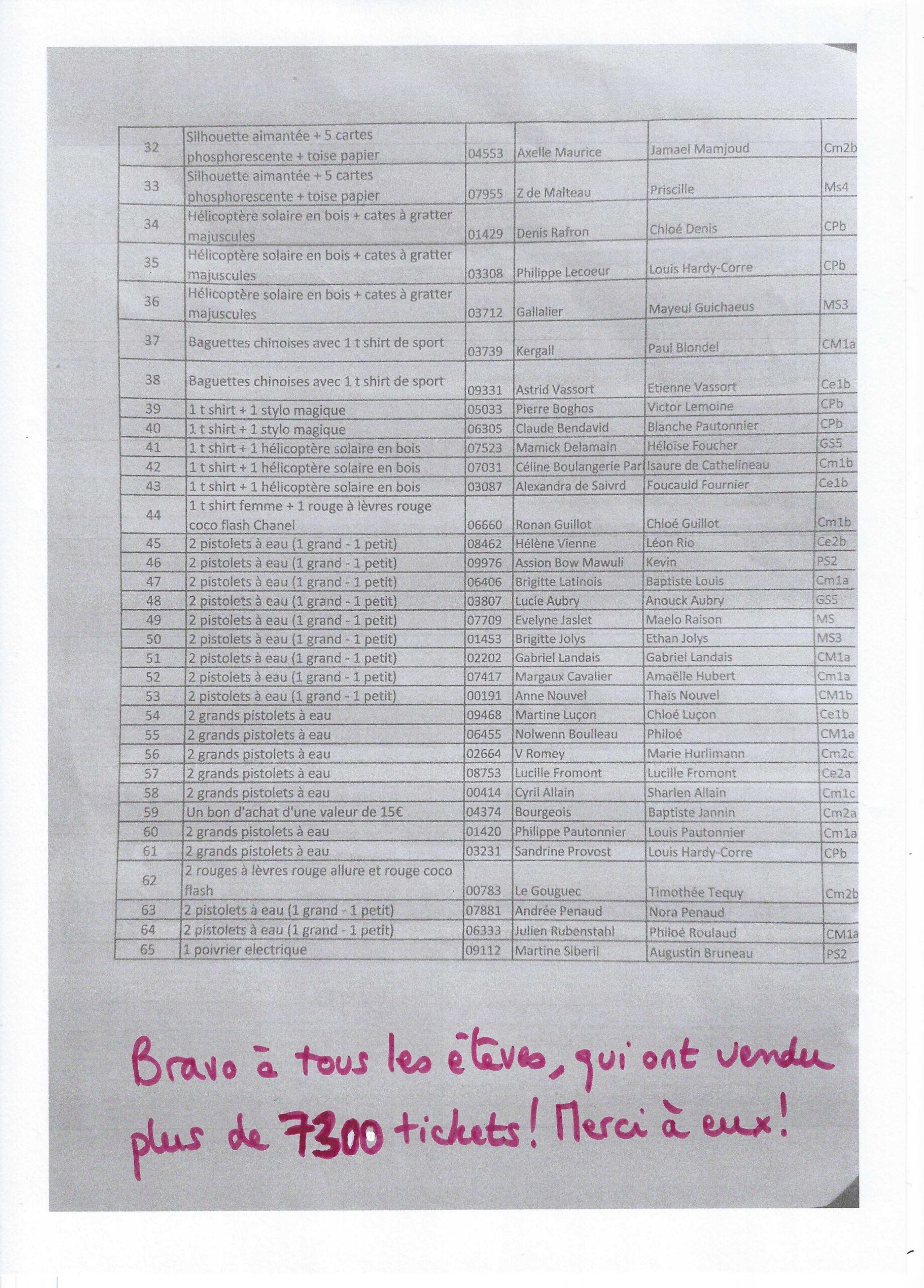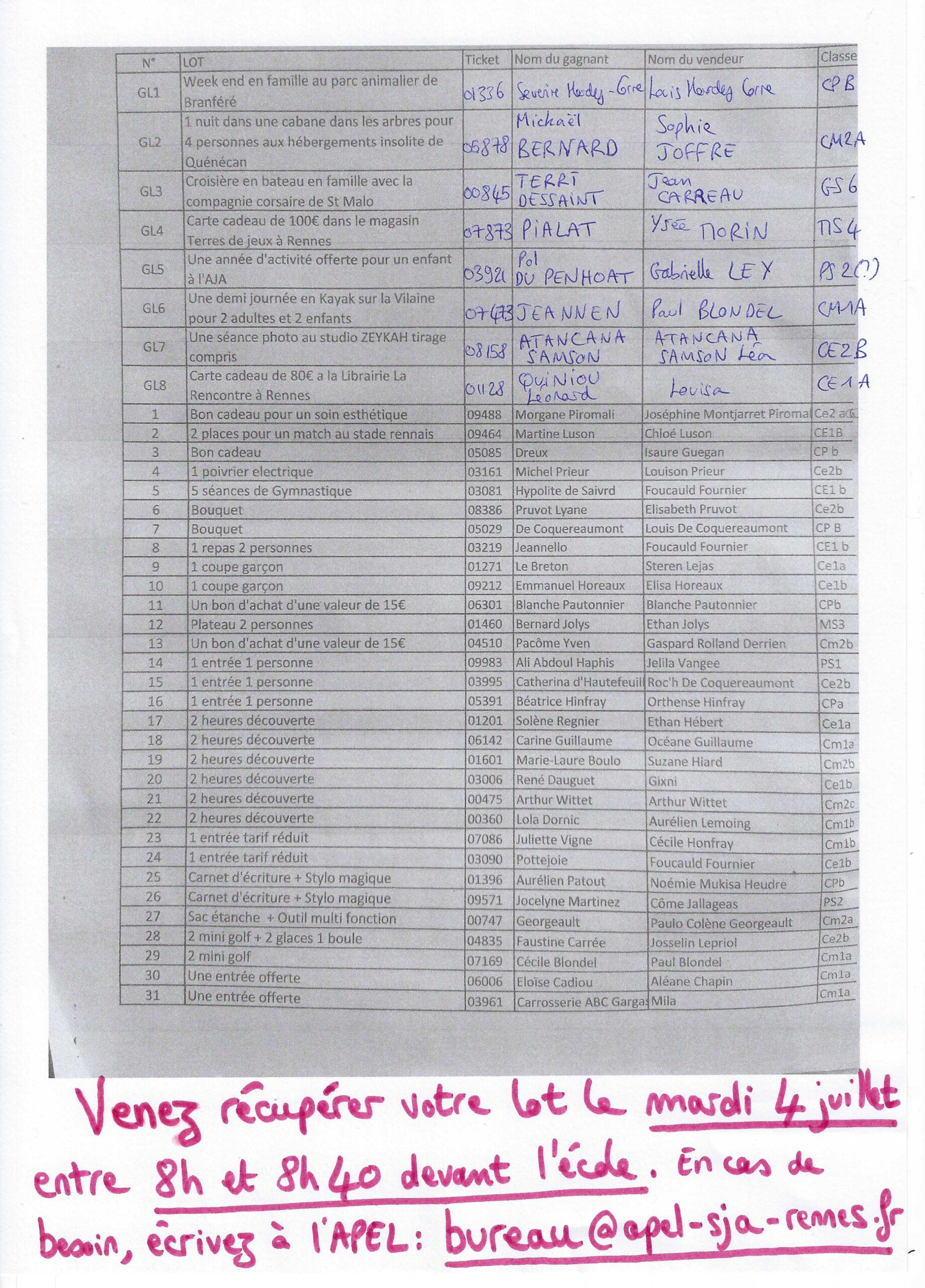 Voici en pièce-jointe la liste des gagnants du tirage au sort de la tombola. Nous vous remercions beaucoup et vous souhaitons un très bel été !!!L'APEL de l'école Jeanne d'Arc