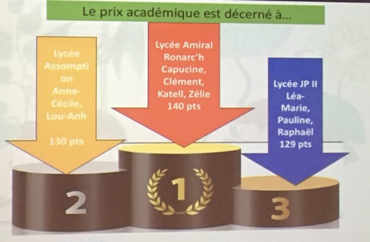 Le mercredi 13 mars, invitées par l’académie de Rennes, Lou-Anh Mettier et Anne-Cécile Richard deux élèves de terminale spé SVT, ont participé à la remise de prix des Olympiades académiques de Biologie à l'Océanopolis de Brest; elles ont obtenu la deuxième place académique. Mme Waendendries, M Gargadennec