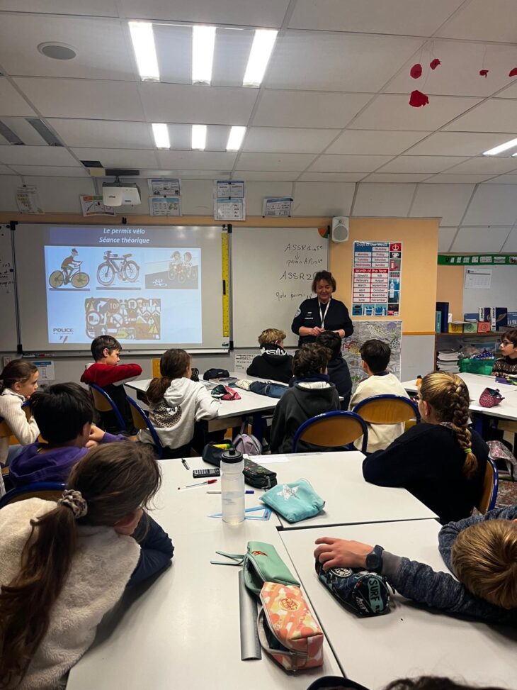 Les élèves de CM2 ont eu récemment une intervention d'une policière municipale concernant le permis vélo comprenant les bases du code de la route, les équipements obligatoires et les règles de bonne conduite à vélo. Dans les semaines à venir, les élèves auront l'occasion de mettre leurs connaissances en pratique à travers un examen écrit et pourront également s'exercer sur un parcours spécialement aménagé pour l’occasion, les objectifs étant de familiariser les enfants avec les principales règles de circulation et les bons réflexes à adopter à vélo ainsi que de rendre les jeunes cyclistes plus autonomes et responsables sur la voie publique, en leur transmettant les bons gestes dès le plus jeune âge.