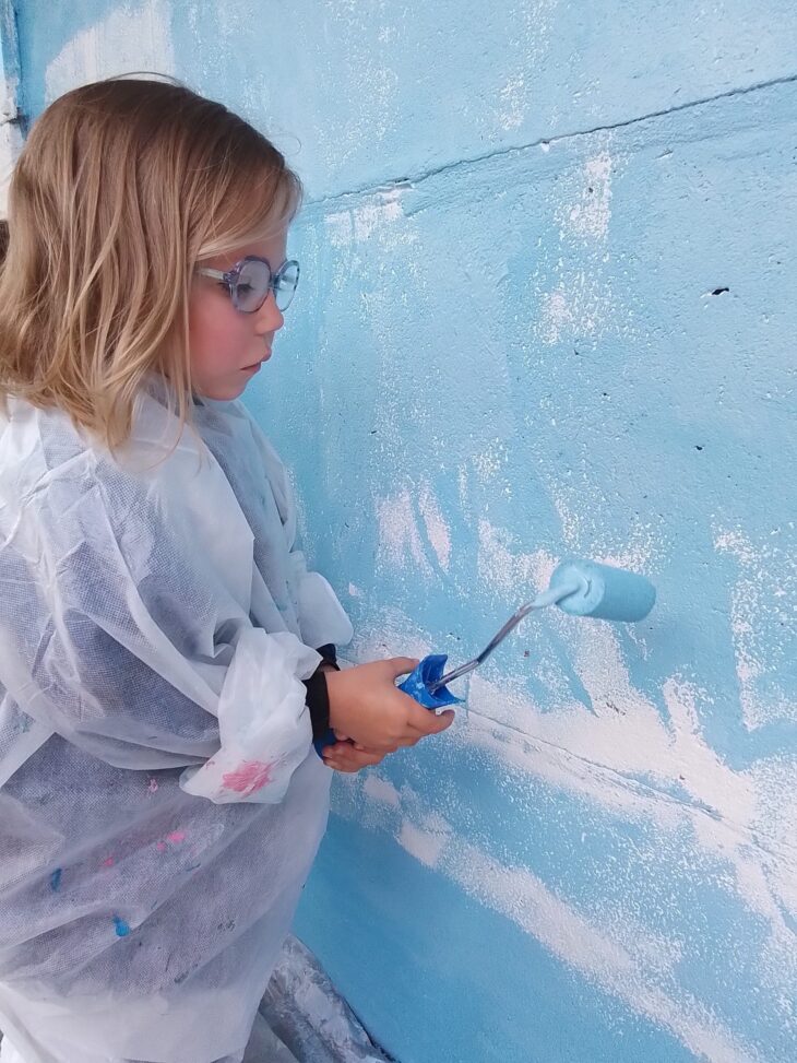 Début mars, les collègues des classes maternelles ont fait part à l’ensemble de l’équipe enseignante de leur souhait de réaliser une fresque sur le mur de la cour à la manière de l’artiste Damien HIRST. Une information a été envoyée aux familles pour récupérer peinture et matériel. Les collègues d’élémentaire intéressés ont pu se joindre au projet qui prend forme, petit à petit …