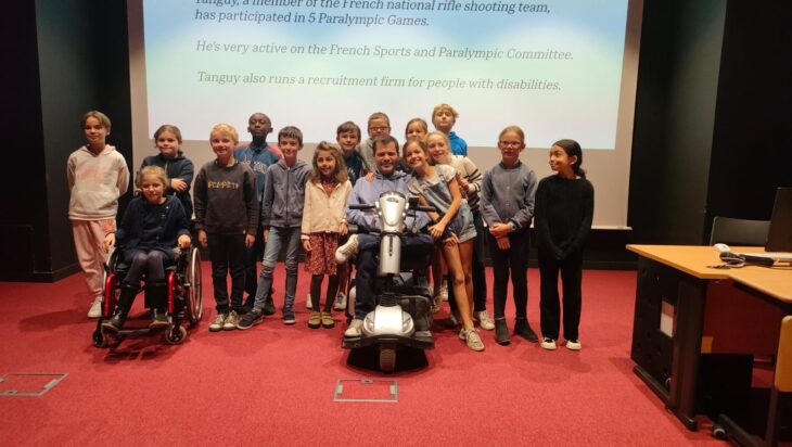 Dans le cadre du projet Erasmus+ sur les J.O. et l’inclusion par le sport, le jeudi 5 octobre à l’auditorium du lycée Jeanne d’Arc, toutes les classes de CM de l’école Jeanne d’Arc sont allées écouter Tanguy de la Forest, un athlète paralympique de tir à la carabine de 45 ans.