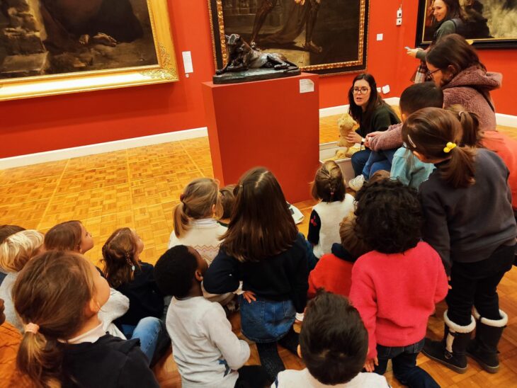Mardi 14 janvier, par des températures très fraîches, les élèves de GS6 se sont rendus au Musée des Beaux Arts pour une visite guidée et animée sur le thème « les animaux dans l’art ». Une visite vraiment appréciée par les élèves puisqu’ils ont pu admirer 1 sculpture en bronze d’une lionne et ses deux petits, un dessin sur les petits pois sont verts et les petits poissons rouges et 2 tableaux gigantesques : la chasse aux tigres de Rubens et Persée délivrant Andromède de Véronèse. La visite était très ludique : des chants, des caresses à des peluches, du tissu à toucher, des imitations d’animaux… Les enfants sont revenus heureux. Mais avant la visite, il fallait patienter, et le froid nous rendait la tâche ardue à l’extérieur ! Nous avons donc opté pour les mosaïques d’Odorico à la piscine Saint Georges et les vieilles photos qui montrent comment les gens apprenaient à nager la brasse entre 1850 et 1950 !